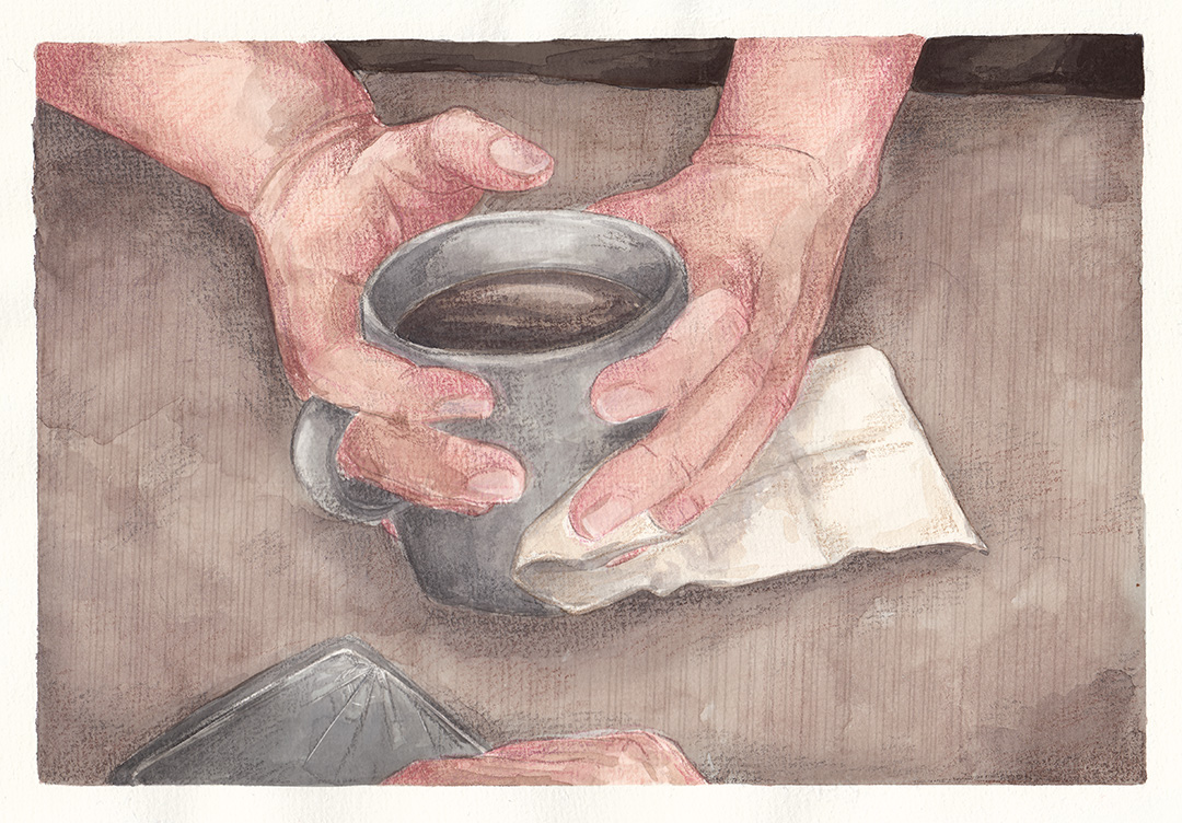 Terwijl wij een tweede kop krijgen ingeschonken, slaan op het kerkhof mensen een kruisteken met zo’n staafje waarin wijwater zit. Het kopje valt zwaar naar beneden wanneer je het van de man met de witte handschoenen in je handen krijgt geduwd en het kruisteken dat je ermee slaat is veeleer een spiraal die in het wilde weg druppels op het hout nalaat, een soort mini-tuinsproeier voor fauna die nooit meer tot leven komt, maar niemand die daarop let.